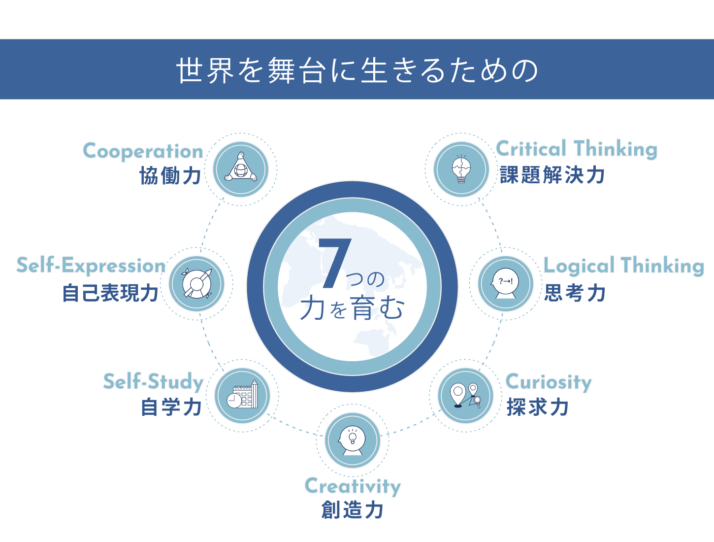 英語ができるということは、英語で学び、考え、英語を使って物事を押し進めることができるということ。そのためには、言語を操る4つの技能である「聞く、話す、読む、書く」のすべてを習得することが大切です。私たち日本人は、中・高で英語を学びながらも、洋画を字幕無しに観る事 が出来ない人がほとんど。一体、なぜでしょう? 理由は「アウトプット」が足りないから。言語習得の目的は本来、「聞き取 り」や「発音」ではなく、「コミュニケーション」、「意志の伝達・共有」です。 学んだことは「使う」ことで初めて身につきます。近道はありません。それこそが言語を習得する最良の方法なのです。