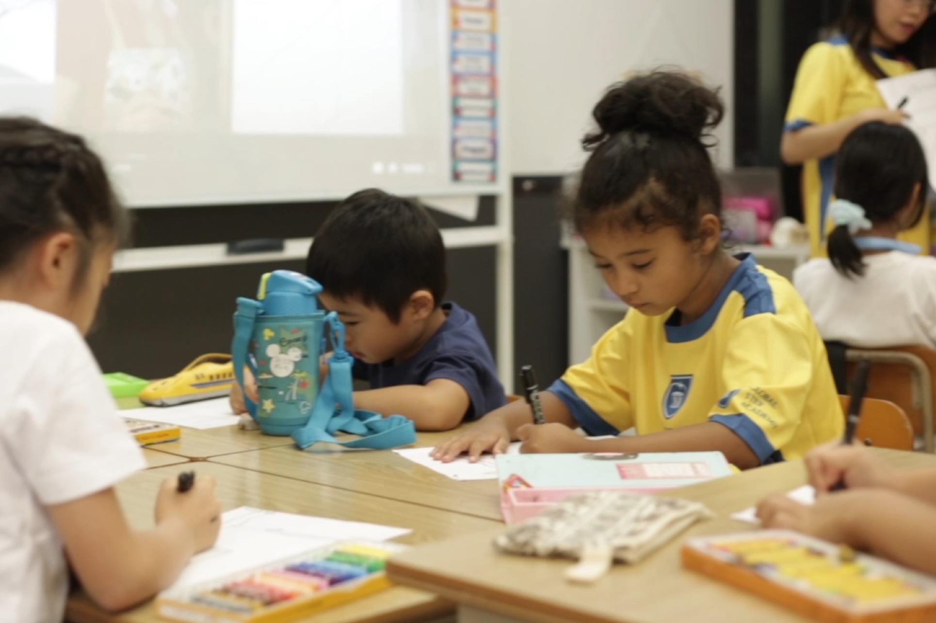 英語を中心として生活になります。子どもたちが自ら関心を持ち、考え、学びを深める探究型プログラムを使用しています。またスポーツプログラムに加え、日本語や食育の時間を持ちます。卒業までに子どもたちは英語や算数の基礎をしっかりと習得し、簡単な算数の問題を解くことができるようになります。美術の才能がある生徒は、創造性を伸ばす機会がたっぷりと与えられます。子どもたちはもうしっかりと小学校へ行くための準備が整います。