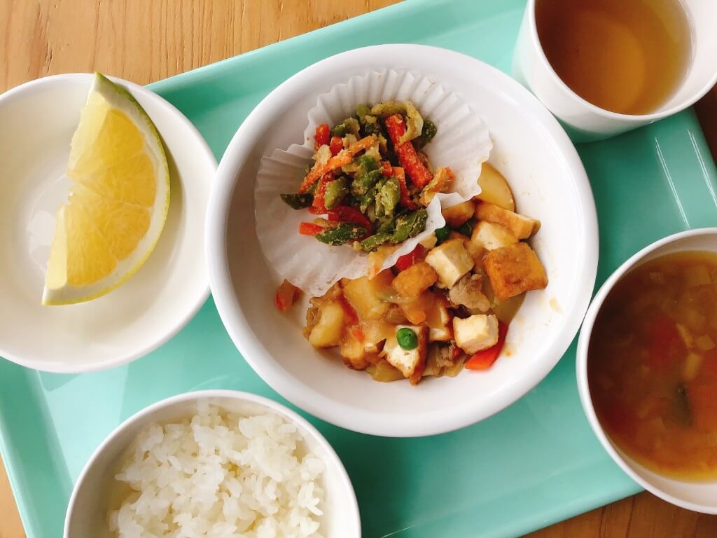 施設内の厨房でランチ・おやつを調理提供しています。離乳食提供、及び一部アレルギー対応も行っております。青果等原材料は産直野菜の取扱や食育の取り組みを行うベジリンクより仕入れています。また、世界各国の味覚と文化に触れてもらう機会として、毎月1回「世界の料理の日」として5大陸の様々な国の料理を提供しています。